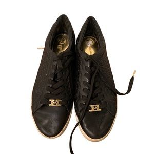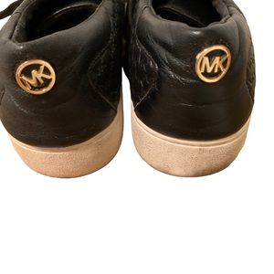 One pair of black leather low top lace up perforated leather sneakers shoes by Michael Kors in a women's size 8.5. The shoes are in good pre owned condition and they offer comfort and style. Offers welcome, thanks for shopping my page!