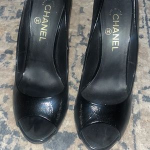 Beautiful CHANEL peep toe patent Leather heels. Size 40 (10). Perfect for a size 9-9.5. These shoes were barely worn and are a show stopper. They exemplify class and grace.