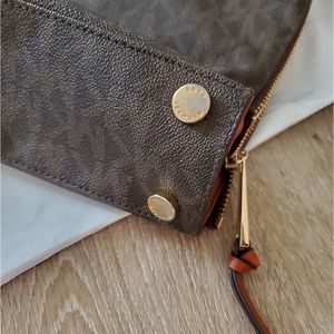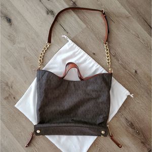 Michael Kors Devon MK Signature Large Shoulder Tote Authentic Color is brown with tan and gold accents Handbag Shoulder bag Purse Crossbody Magnetic button closure Side zippers Inside has 2 open pockets on one side and 1 zipper pocket with 2 open pockets on the other side Pockets are lined with leather matching the handles and strap Signature MK interior lining is beige with tan leather trim Interior attached keychain Gold tone accent chain on the long strap Long strap is adjustable and removable Gold tone hardware with Michael Kors etched in Bag is apprx 17" x 15" x 4.5" Apprx 17" strap drop length Apprx 7" handles drop length Double handles Slight flaws in the last 6 pictures Possible marks on the back toward the bottom Small interior marks on the bottom and corner of the inside lining One small scuff between the handles One small scuff on the underside of the strap One small pen mark by the closure Some discoloration on the feet Indulge in Michael Kors style Showcase this roomy, modern satchel to work, school or to tote around your essential everyday items. Made with durable Siganture Saffiano leather and polished gold tone hardware. Michael Kors Durable Michael Kors Signature saffiano leather; Double top handles; Second strap with adjustable length; Magnetic Snap Closure; Gussetted sides with adorable zipper detail; Fully lined interior with zip pocket, 4 open pockets for your cell phone, keys, and make up Includes original dust bag