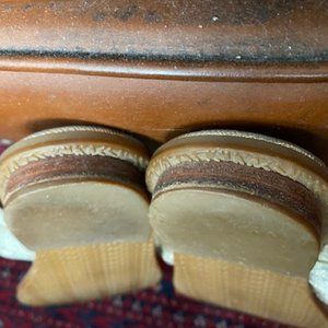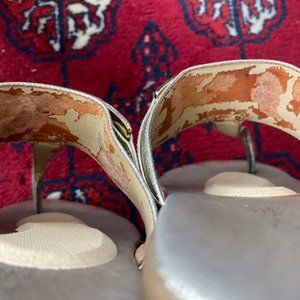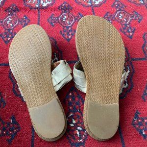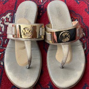 MICHAEL KORS ~ Warren style * FLIP FLOP Sandals in GOLD LEATHER (including the inner sole) with wide GOLD-tone metal band across the 1-1/2" instep strap with MK LOGO. Squishy soft, padded insole (but I did put a stick-on shoe pad on each shoe's inner sole to keep from sliding). Some "shadowing" around the toe and heel areas from normal wear (but those won't be seen when you wear them). Also, the other "flaw" is the underneath side of the wide instep strap where the leather has peeled (because it's so soft ~ 3rd photo from the end), but that's underneath and can't see it at all when you wear them (can't feel that either). I put photos to show that there's no scuffing or scratches on the 3/4" heels and the textured bottom soles look brand new (the texture is MK). Size is 7-1/2 and 9-3/4" from the tip of the toe to back of the heel (inner sole) and 3-5/8" across at the widest point. I can ship up to 5 lbs in the same box for cost of shipping just 1 listing, so look through my closet to see if you want to bundle with more items.