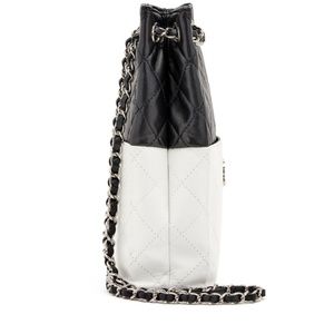 This adorable Chanel Black and White Lambskin Small Shopping Tote Bag is from the 2009 collection. It features soft lambskin and a silvertone CC at the center with two flat pockets. An entwined leather and chain strap can be worn with two straps or as one. Perfect for all your small essentials!