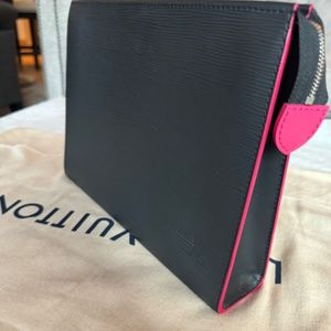 This is an authentic Epi Toiletry Pouch 26 in Black and Pink. This stylish toiletry case is made of beautiful textured epi leather in black. The case is structured and features a polished silver top zipper that opens to a black leather interior that has a patch pocket. Comes with a custom pink liner to protect it.