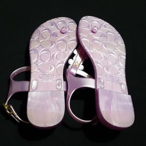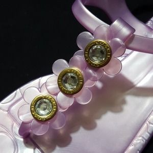 Features: faux rhinestone floral accents on thongs; adjustable gold buckles on ankle straps