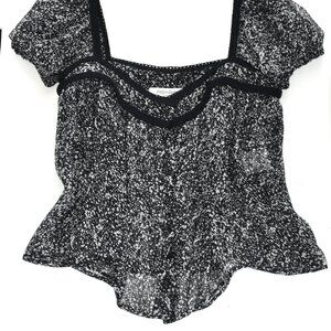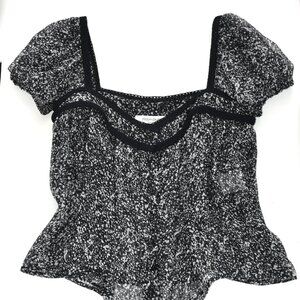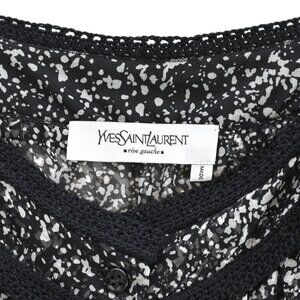 In Like new condition as have been worn only once for a fashion show. Yves Saint Laurent 100% Silk Black & White Top/Blouse. * Semi-sheer construction * Black Crochet trim * Size : France 40 - US: 8 * Front button fastening * Curved hem * Made In Italy