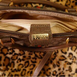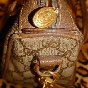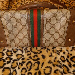 This medium-sized bag is lined with beige cotton material and comes with inner pockets to store your essentials. Its water-resistant feature ensures that your belongings are protected from any unexpected spills or rain. Made with high-quality materials and finished with the iconic Gucci red/green stripe, this bag is a must-have for any vintage lover.