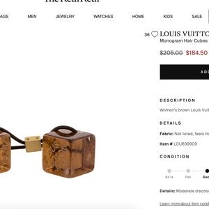 I attached screenshots from the real real for example . these are slightly used pink cube hair ties, the cubes has little charms inside as well as the monogram . the middle gold metal piece that moves around is engraved with louis vuitton paris text .