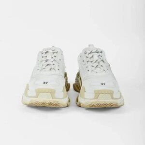 The famous Balenciaga Triple S Sneakers in white leather-free rubber with beige detailings feature a round toe, an embossed logo on the side and at the heel, the size number embossed on the toe box, a lace-up closure with black and white laces, the Triple S rubber branding on the tongue, a back pull-on tab, and a complex 3-layered platform outsole.