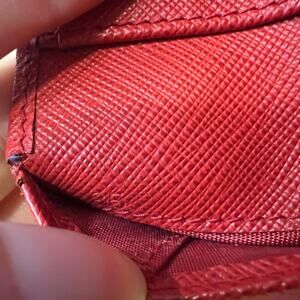 DESCRIPTION • Prada Wallet • Red Saffiano Lux Leather • Gold-Tone Hardware • Leather Lining with Card Slots • Snap Closure DETAILS Estimated item measurements Height: 4" 3/4 Width: 4" Depth: 1" Good Condition. Moderate scuffs throughout; moderate scratches and discoloration at hardware.