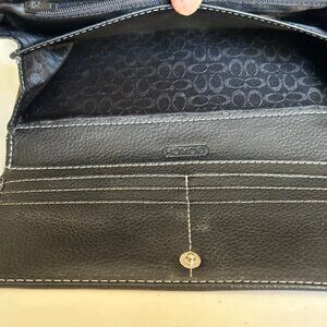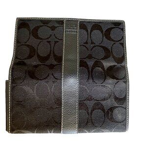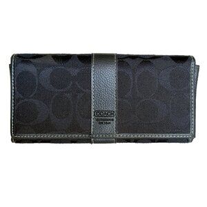 Coach Black Signature Trifold Billfold Wallet - 71/4" x 3 3/4". Pre-owned and in very good condition. Interior pockets include on zippered pocket and two full-length slots for bills as well as multiple slots for credit cards. Nice looking, slim wallet.