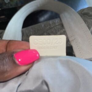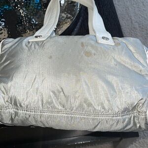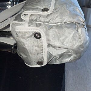 Rare Celine cargo puffer bag, gray fabric w/ silver reflections and white leather.