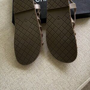 Beautiful sandals.  Very stylish as only Chanel can make. I wear a 9.5 and they do fit perfectly.  Has a built in arch.  Color is a  Metallic tawny/gold color.  Very neutral and can go with any item.