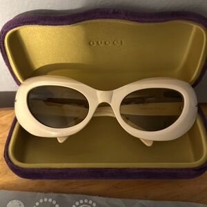 Gucci oval shape sunglasses. White with Gucci written in gold letters
