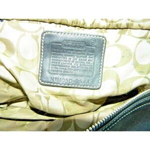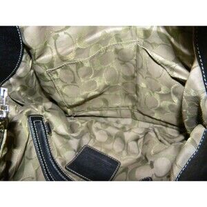 This vintage Coach Soho handbag is a stylish addition to any outfit. With a rectangular shape and black leather exterior, it is a medium-sized shoulder bag with a zip closure and double handles. The bag has a beige fabric lining and features a key holder, bag charm, and detachable strap. The bag is 13 inches wide, 8 inches tall, and 4 inches deep. It has a matte finish and silver hardware. The handle and strap are made of leather. The bag is lined with fabric and has inner pockets and an audio pocket. It is a Coach product from China and the model number is D05D-9544.