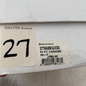 Balenciaga Caraibe Thong Studded Sandal. Pacifique. EU 39.5. Leather T-strap sandals. Studded Accesnts. Strap and Buckle Closure at Ankles. These sandals comes with dust bags and a box. The box is not torn but have marks on it (only the box). These are NWT but old styles from maybe 10 years ago or less. It's never been worn but tried on at the store. Please see pictures carefully before purchasing. The tags are displayed in the photos for you to do research before purchasing.
