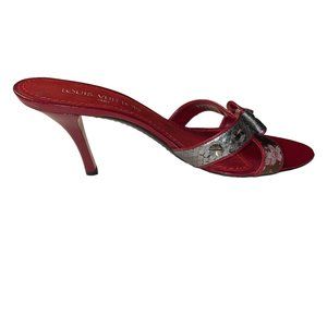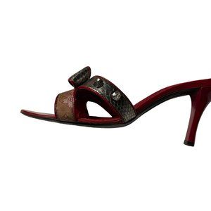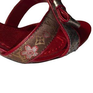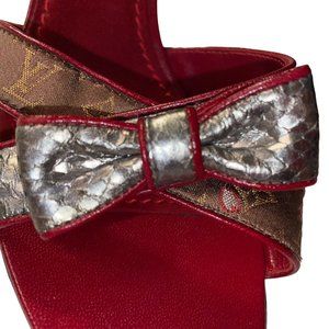 Limited edition heeled sandals from Louis Vuitton collaboration with artist Takashi Murakami. Vintage and rare. Signature Cherry Blossom Monogram Print on one of two straps. Second strap is silver snake skin. Accent bow of made of silver snake skin. Red edging on straps and bow. Red high heel. Padded suede insole. Made in Italy.