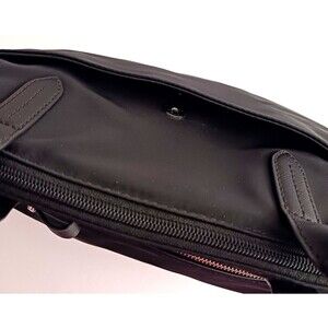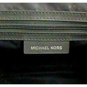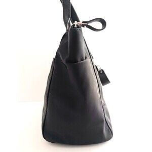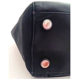 The Michael Kors Kelsey Large Tote in Black Nylon with Black Saffiano Leather Straps is a designer handbag with a classic style. It features a solid pattern, zip closure, and silver hardware. The tote has a spacious interior lined with black nylon and includes inner and a large outer pocket for organization. The black saffiano leather double handles provide a stylish contrast to the nylon exterior, making it a versatile and chic accessory for women who appreciate quality and sophistication. 15W 10H 5D Strap drop 9.5". Bag is in excellent pre owned condition, clean inside and out, top handles look great, slight finish wear on the bottom bag studs.