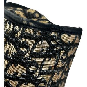A classic 1980s Christian Dior navy trotter monogram clutch bag. Features a pochette style curved shape with top zipper and leather lining.