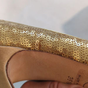 CHANEL Quilted Sequin Satin round toe gold celebrity heels size 6.5