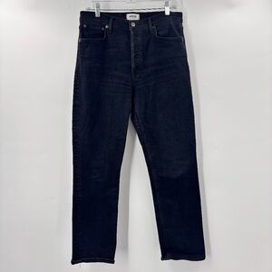 Low to mid rise, zip and button closure, large pockets, slim fit, and a black/gold stripe down sides.