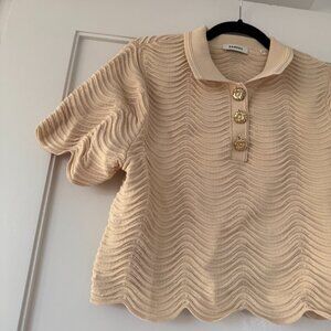Sandro Paris Campia Cropped Sweater Naturel Wavy Knit Scalop Hem Polo Style