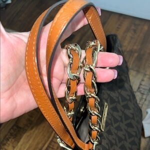 Stylish Michael Kors tote with matching wallet. Features signature MK logo design. Gold-tone hardware.