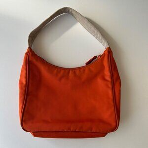 This petite Prada shoulder bag combines vibrant orange nylon with a beige strap, offering a statement piece for essentials and daily use.