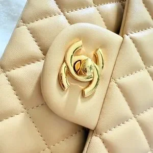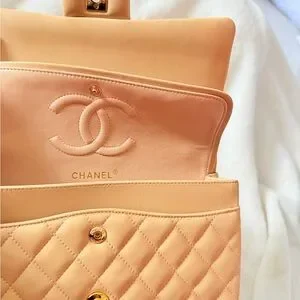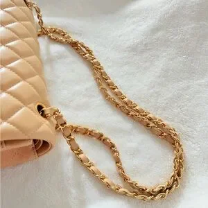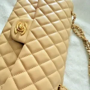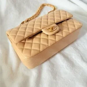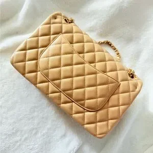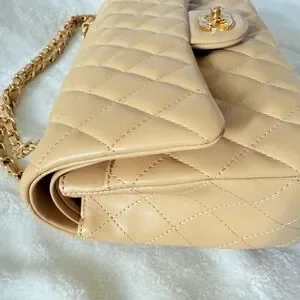 Elevate your style with this Chanel beige quilted leather bag. Featuring a luxurious chain strap, it's perfect for any occasion.