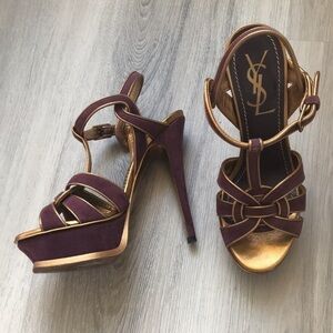 Yves Saint Laurent Suede Sandals Purple suede Gold Trim Stiletto Heels with Platform Straps & Buckle Closure at Ankles Size 5.5 Made in Italy Excellent condition