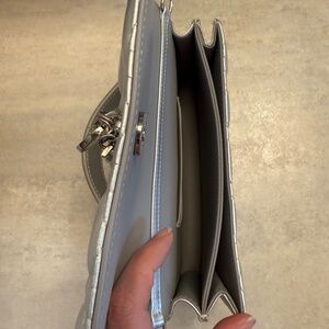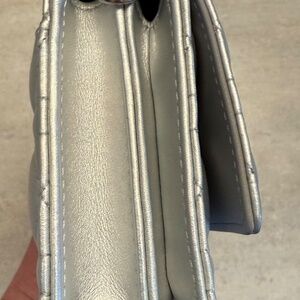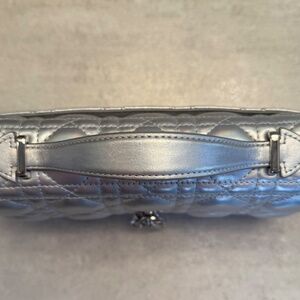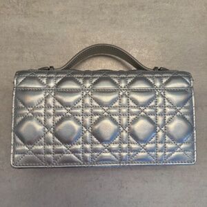 The My Dior silver holographic mini bag expands the line with an elegant and functional design. Crafted in Rose des Vents Cannage lambskin, it features a flap enhanced by D.I.O.R. charms on the front. Equipped with compartments and card slots, the functional accessory holds all the essentials and is the ideal day and evening companion. A top handle completed by a removable chain with resin pearls allows the bag to be carried by hand or worn crossbody.