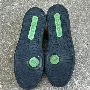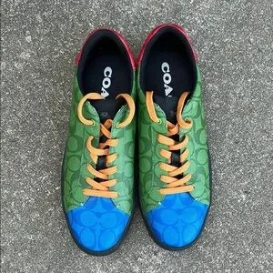 Stylish Coach sneakers with a vibrant green and blue design. Features orange laces for a pop of color.