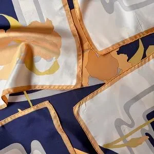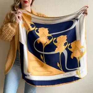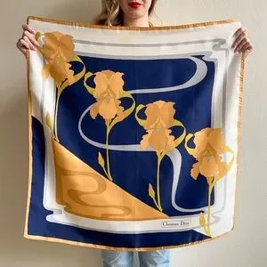 Happiness is a luxurious scarf! Vintage scarf features four muted orange iris flowers in front of a navy blue background with gray swirls. White and navy edge is surrounded by a muted orange thin border. Christian Dior label featured in the bottom right corner. Hand rolled sewn edges. Please note: there's a couple marks on the fabric. Light weight. Label is Christian Dior. Fabric content is silk. Scarf is in great condition. Freshly dry cleaned and ready to wear!