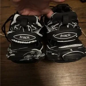 Stylish Balenciaga sneakers in black and white. Perfect for a trendy look.