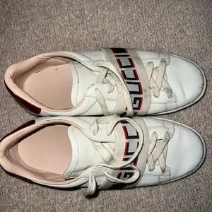 Stylish Gucci sneakers in white with red and black accents. Perfect for casual wear.
