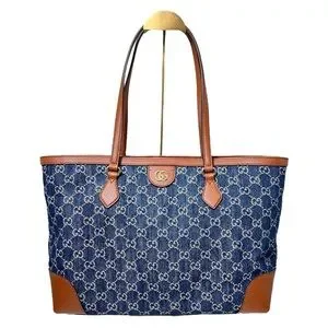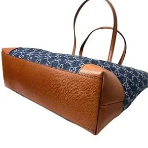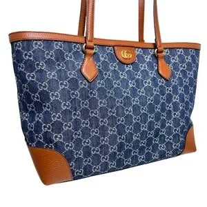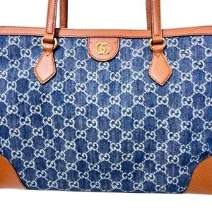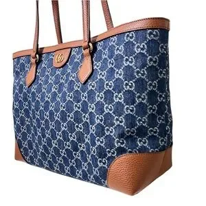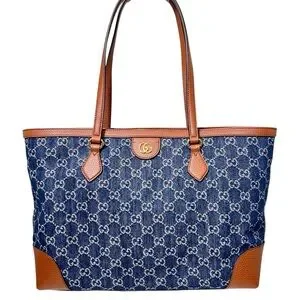 A blend of luxury and functionality, this Gucci Ophidia Tote is crafted from GG navy denim with rich brown leather trim. Spacious enough for a laptop, tablet, and daily essentials, it's both stylish and practical.