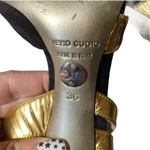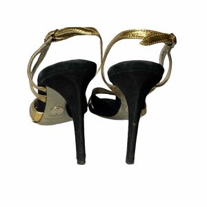 These shoes are stunning! Features black suede with gold leather and snake trim. Peep toe sling backs make these perfect for anytime or any occasion. The shoes are a size 36 and the only flaw on them that I see is left over tape on the insole from foot pads. These shoes have plenty of life left in them!