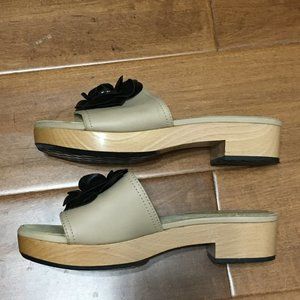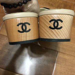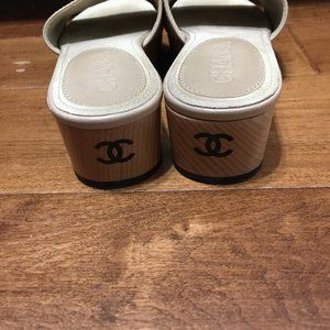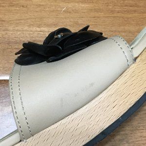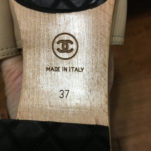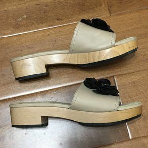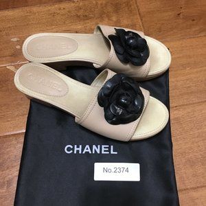 CHANEL Cream and Black Sandals with Elegant Flower Detail