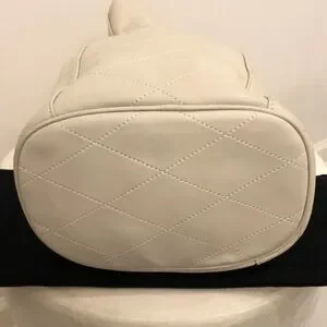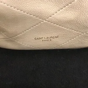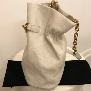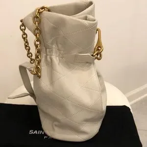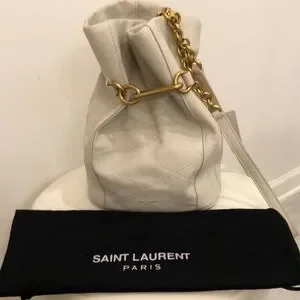 This Saint Laurent shoulder bag exudes elegance with its striking cream and gold color palette. The bag features a sophisticated gold-tone chain and a unique gathered design, creating a chic and modern silhouette. Ideal for elevating any outfit with a touch of luxury.