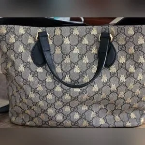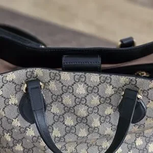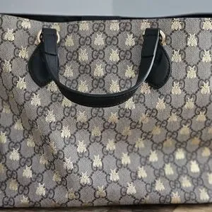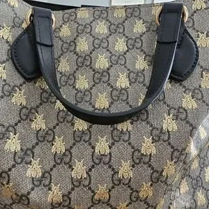 Elevate your everyday style with this authentic Gucci Ophidia tote, crafted in GG Supreme coated canvas and adorned with iconic gold foil bee prints. The structured silhouette is accented by black leather trim and gold-tone hardware, complete with dual top handles and a detachable/adjustable shoulder strap for versatile wear.