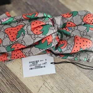 Add a playful yet luxurious touch to your accessories collection with this authentic Gucci Strawberry Print Headband. Made in Italy from 100% silk, this statement piece features the iconic GG Supreme monogram background overlaid with bold, whimsical strawberry graphics in vibrant red, green, and pink tones.