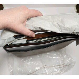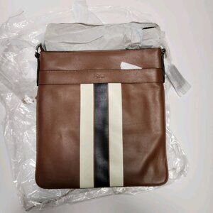New in original packaging. Minor shelf wear. Estate find. Coach New York Brown Pebbled Leather Charles Varsity Stripe Bag. Leather with zip closure and adjustable cross-body strap and Coach hangtag. Retail $295