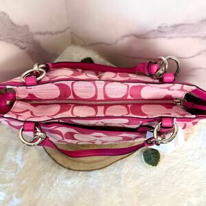 This new with tags stylish Coach Alexandra Signature shoulder bag features the iconic Coach "C" logo pattern in pink jacquard canvas with pink leather trim and silver tone hardware. MSRP $358