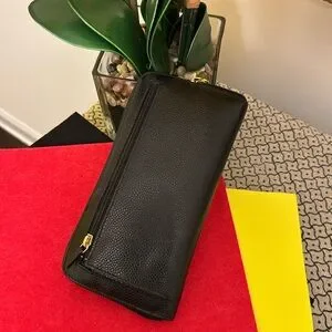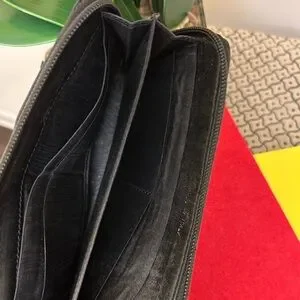 CHANEL Authentic Zip Around Wallet. Pre-Owned and Pre-Loved Black Leather wallet and dust bag has multiple card slots, zipper coin compartment, logo on zipper pull, inside serial intact. Call outs are interior pre-loved wear, but no holes, tears or cuts. Please Examine All Photos.