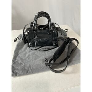 Balenciaga 'Nano' Black Leather Neo Classic Bag: croc embossed leather with leather lining and gunmetal-tone hardware, adjustable and detachable shoulder strap, zip top closure, front zip pocket, interior slot pocket.