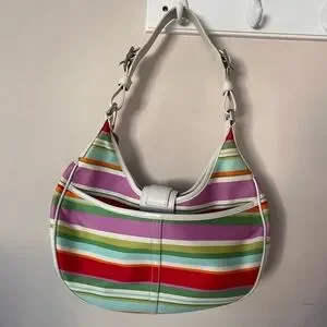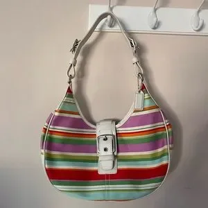 Add a pop of color to your outfit with this stylish striped hobo bag. Featuring vibrant shades of red, pink, green, and white, this bag is perfect for any occasion. Its unique design and bold colors make it a standout accessory.