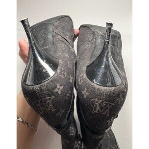 Louis Vuitton Black Canvas Monogram Boots Stiletto Heel Silver Buckle Sz 36 6