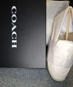 Elegant white espadrilles by Coach. Perfect for casual outings. Features classic design.