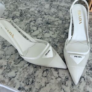 Step into elegance with Prada's white slingback heels, featuring a sleek pointed toe and delicate strappy design.