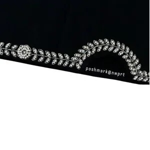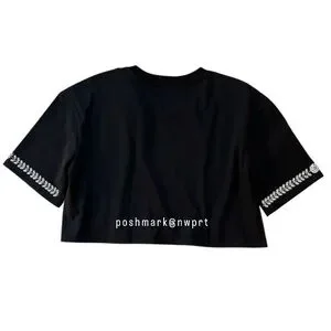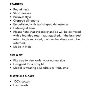 Short sleeve tee with elevated details. Embellished with leaf-shaped rhinestones and a cut-away hemline at front. Cropped, boxy fit. 100% cotton bodice. Is loose fit but runs TTS; see photos for measurements.