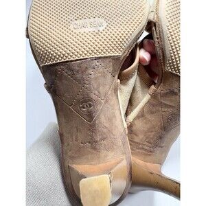 Chanel Camelia Heel Sandals Tan Fabric Leather w/ Blue Bead Accents Y2K Sz 37 7