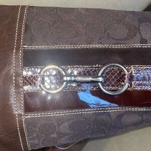 RARE Coach Yvette Tall Leather & Logo Fabric Mixed Media Boots sz 7.5 - Brown. These stunning boots feature dark brown genuine leather around the foot areas and tops of the shafts, classic "C" logo fabric shafts, side stripe mixed media panels of suede, snake embossed & patent leathers, silver Coach embossed horse bit accents on sides (they jingle a bit when you walk), pull on styling, tapered stacked wooden heels, grippy rubber bottoms. Gently worn with some light overall scratches/watermarks (which could be cleaned/polished away), bottom/heel/heel cap wear and not a flaw but the left boot leather that was used has more of a textured grain to it (see pics). If you want a pair no one else will have or you are a Coach collector - grab these beauties today! No lowball offers will be accepted.